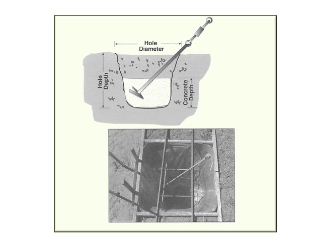 Wind turbines that are smaller than 60 inches (1.5m) can be secured with "screw" augers. Bigger wind turbines require augers set in concrete. Screw-in anchors can be set in dense clay, gravel and sand as well as hard silt. If you are unsure, use concrete. A 4ft (1.2m) deep hole with 2.5ft (0.8m) diameter can take 2 feet (0.6m) of concrete to ensure that the auger helix is covered while giving the required holding strength. The anchor must be securely fixed below the local area's frost level to avoid "jacking" (the tendency of buried objects to push upwards during freeze or thaw). The concrete hole must be lined with rebar for good support.
